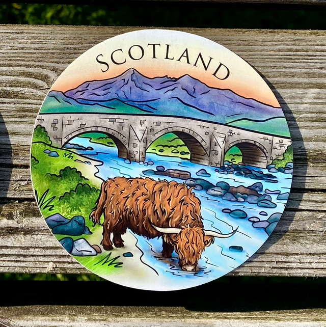 10x10cm vinyl sticker with a Highland cow in Scotland next to an old bridge and river.