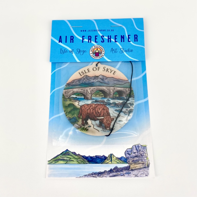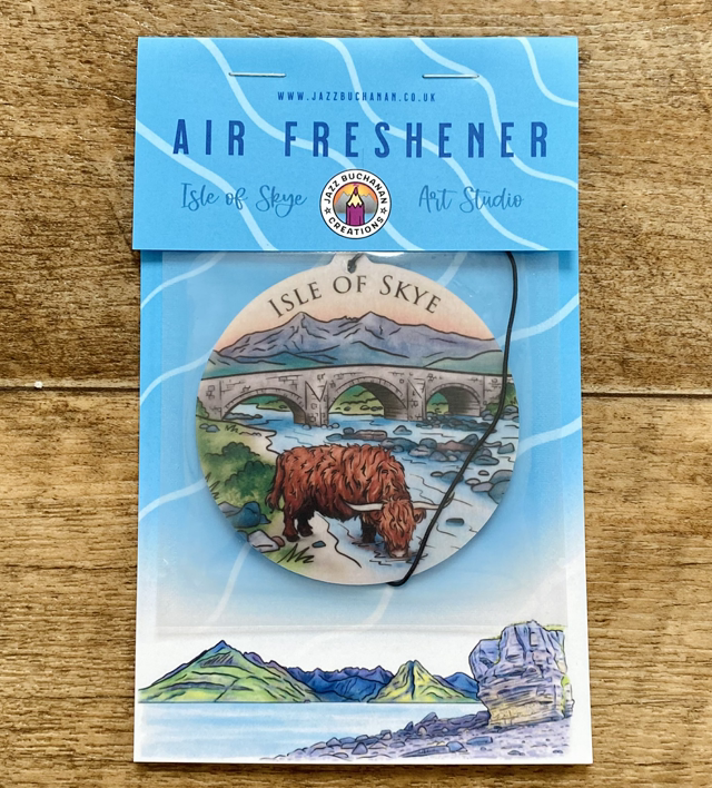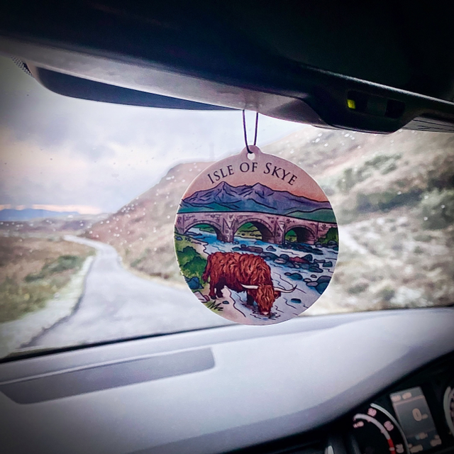 Air freshener with Isle of Skye illustration featuring a Highland Cow at Sligachan Old Bridge. The air freshener has been soaked in ‘Lochs of Scotland’ scent and comes wrapped in beautiful Skye inspired packaging. Designed by Jazz Buchanan in Elgol, Isle of Skye.
