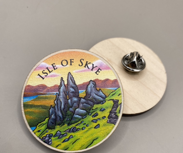 Wooden pin badge with Isle of Skye / Old Man of Storr design by Jazz Buchanan, an illustrator based in Elgol on the Isle of Skye.