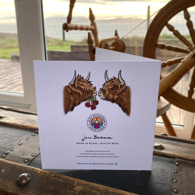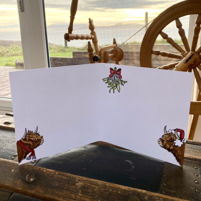 Luxury 148x148mm Christmas card and envelope, with two Highland Cows kissing under mistletoe. Main colours are red and brown. Printed on 350gsm recycled paper card. Comes with a kraft brown or red envelope (depending on availability).