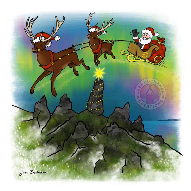 Santa flying over Old Man of Storr Skye - Christmas card