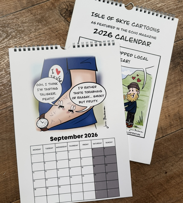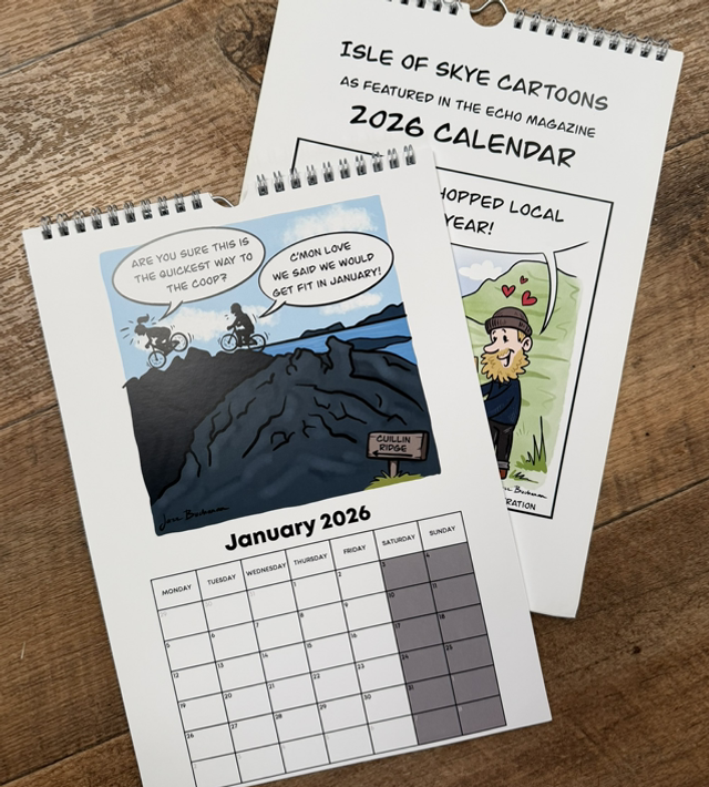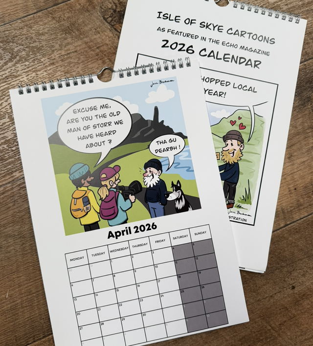 A4 size calendar with cartoons created for The Echo magazine, distributed in Skye & Lochalsh