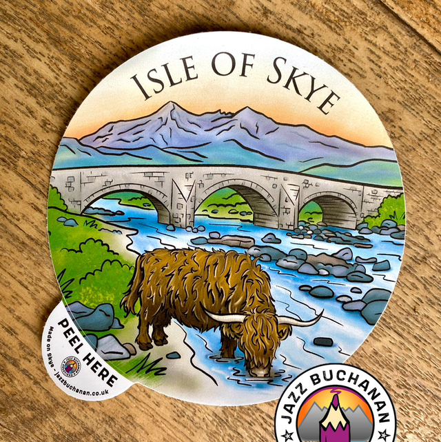 A 10x10cm vinyl waterproof sticker featuring a Highland cow at Sligachan old bridge on the Isle of Skye, buly landscape illustrator Jazz Buchanan based in Elgol on Skye.