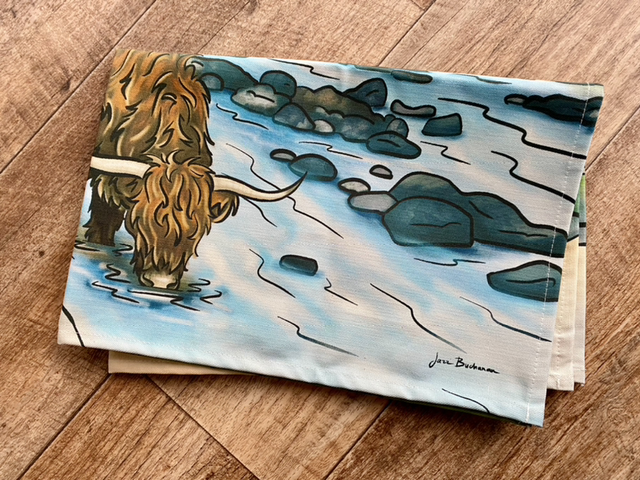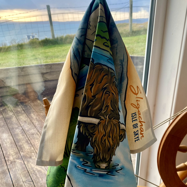 Luxury high-quality non-bleached cotton tea towel with a Highland cow at Sligachan bridge on Isle of Skye. Professionally printed with a handy loop for hanging.